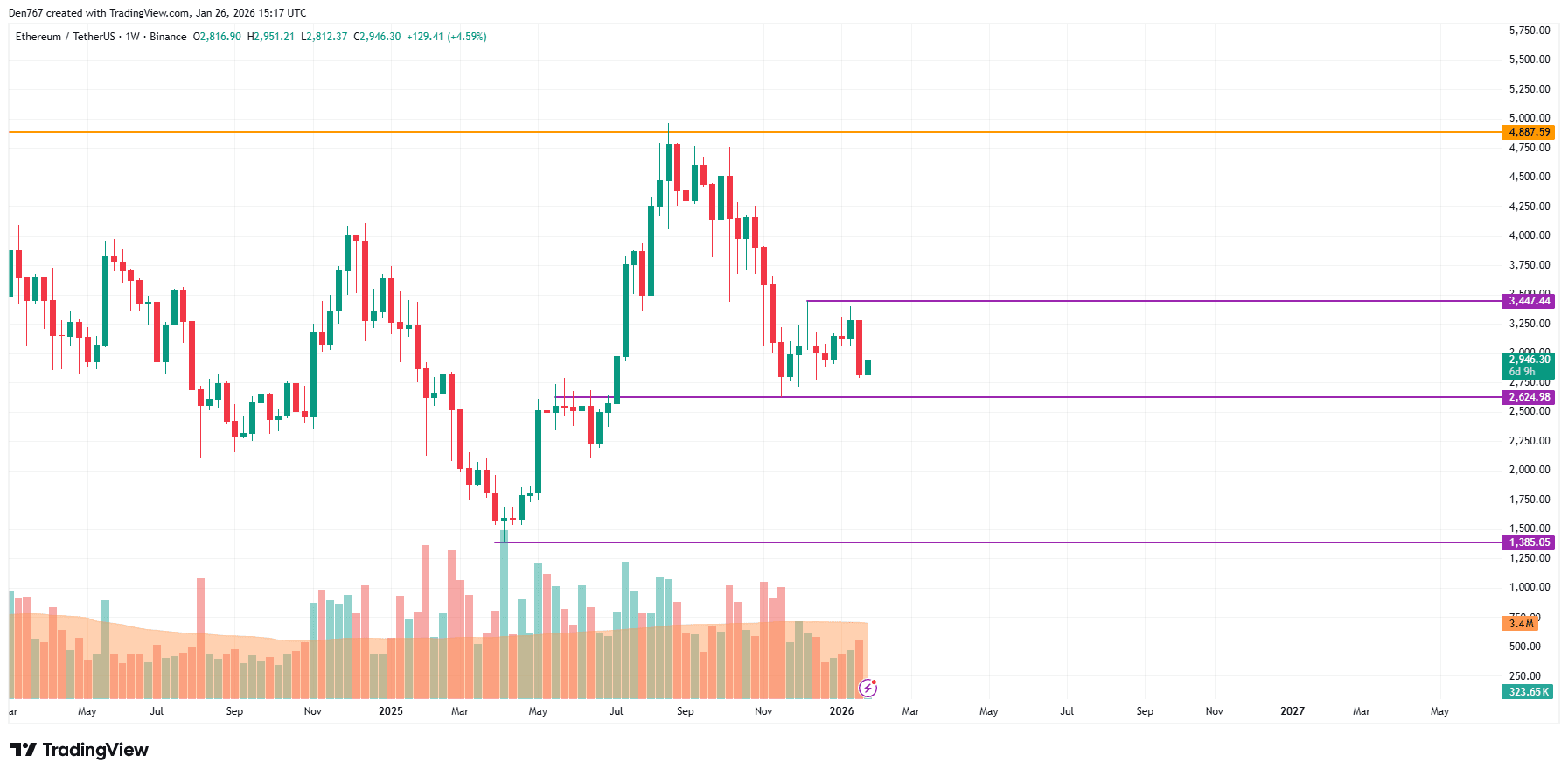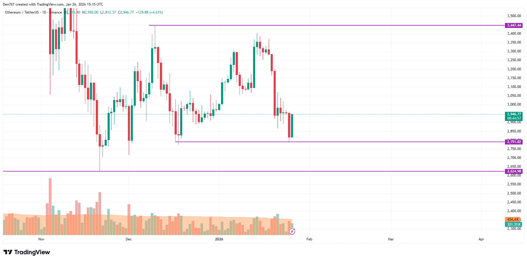 На более длительном временном интервале цена основной альткойна растет после ложного прорыва поддержки на уровне $2,791. Тем не менее, объем остается низким, что означает, что трейдеры вряд ли увидят резкие движения в ближайшее время.