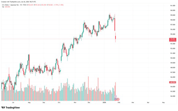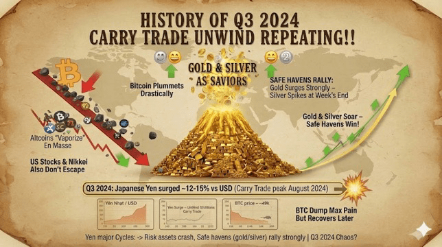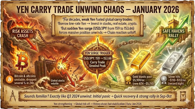 ⚠️ Но когда йена внезапно укрепляется (USD/JPY падает с 159 → 153):