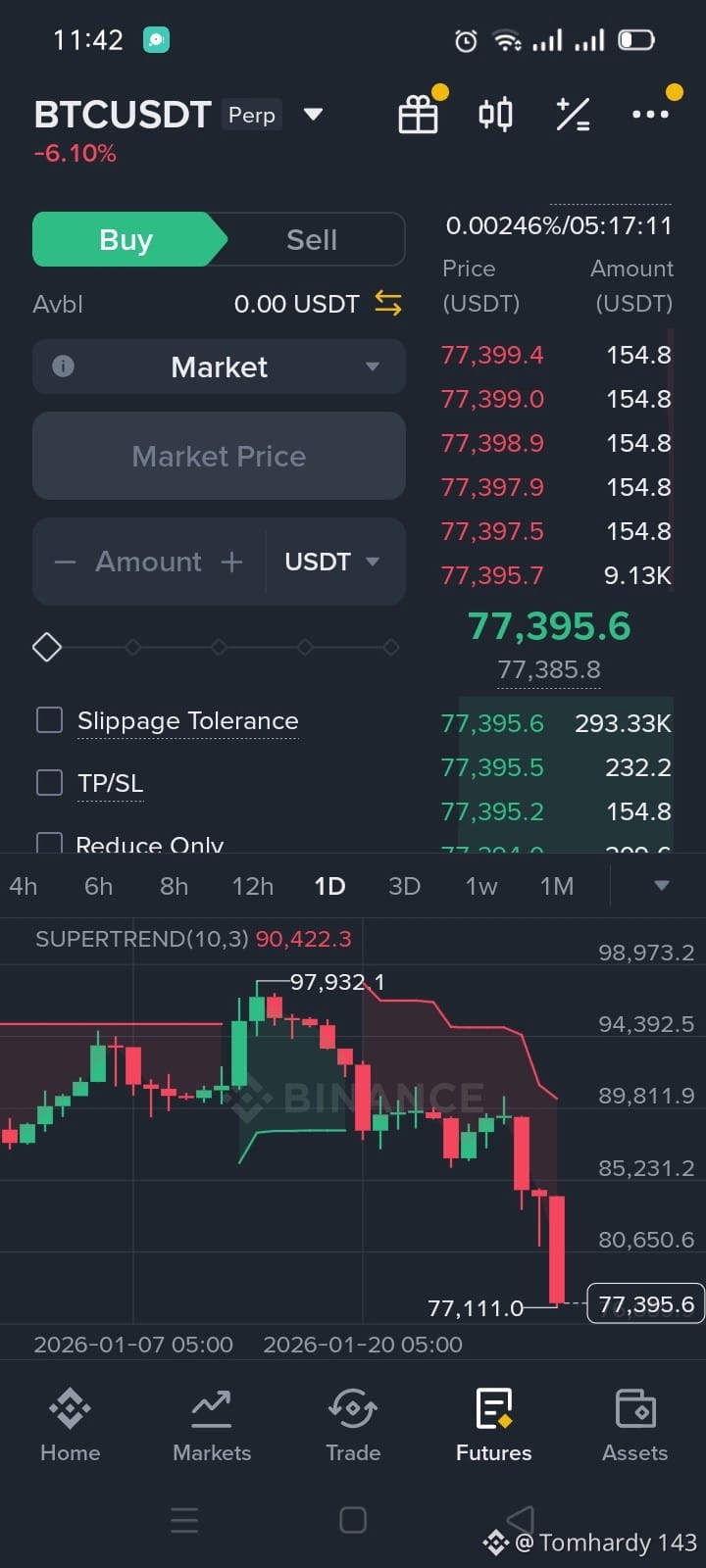 $BTC Bitcoin (BTCUSDT Perpetual) is under strong selling pressure. In the picture, the price has dropped about 6% and is trading near 77,000 USDT. The daily (1D) chart shows big red candles, which means sellers are controlling the market.