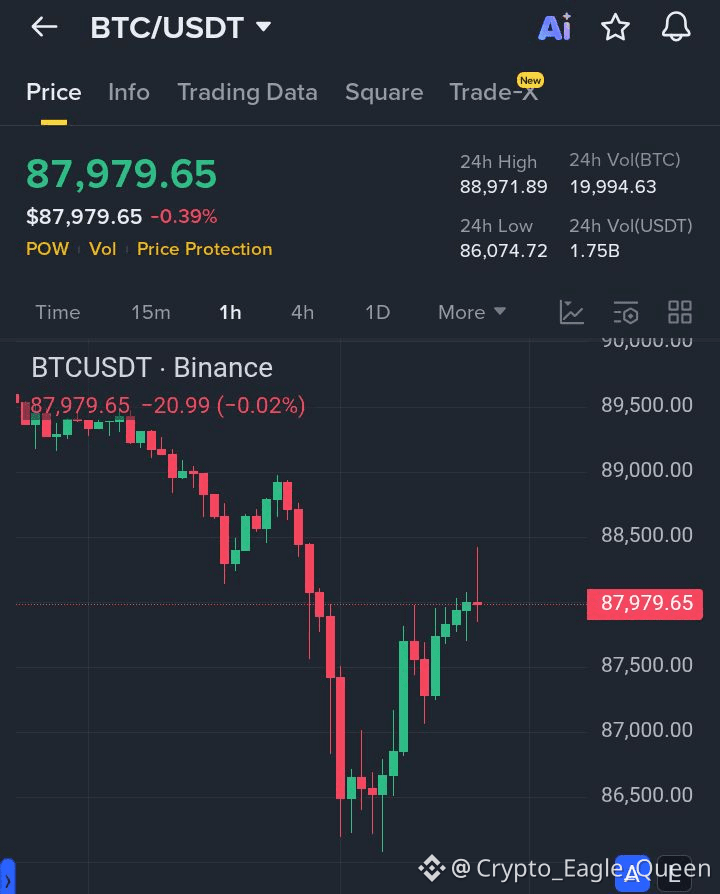 2️⃣ Technical: Price is trading around $87,979. Support is sitting near $87,500 and $87,000. Resistance comes in at $88,500 and $89,500. Holding above support keeps upside chances alive