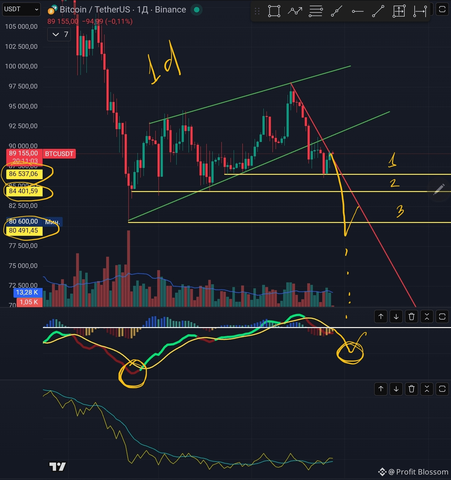 $BTC Доброе утро дорогие друзья! На дневних графиках мы можем видеть три уровня поддержки цены, от каждой из них может быть реакция. На картинке я нарисовал идеальный вариант того, чего я ожидаю от цены, прокол цены ниже предыдущего минимума 80.6k с отчётливой бычьей дивергенцией. Но как и я, идеальный варианты видят все и поэтому он будет отличаться от ожидания