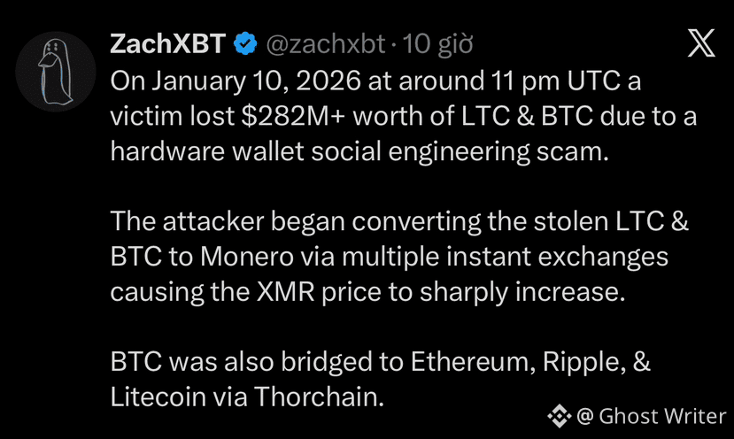 According to on-chain investigator @ZachXBT , a victim lost over $282 million in $BTC and $LTC after falling for a sophisticated social-engineering attack targeting their hardware wallet. The attacker gained remote access, drained the funds, then immediately laundered portions by swapping $LTC/$BTC into $XMR (causing a sharp price spike) and routing 818 BTC (~$78M) through THORChain into 19,631 ETH, 3.15M XRP, and 77,285 LTC.