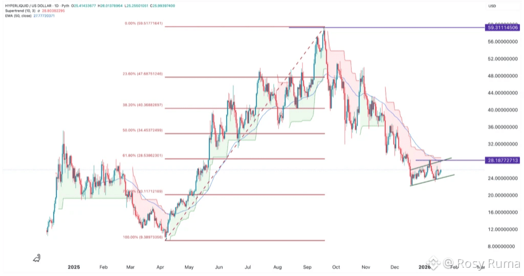 HYPE, the native token of Hyperliquid, has remained under heavy pressure over the past few months. After peaking at a record $60 in September, the token has fallen sharply to around $25.8, marking a steep 56% decline. The recent price action suggests that bearish momentum is far from over.