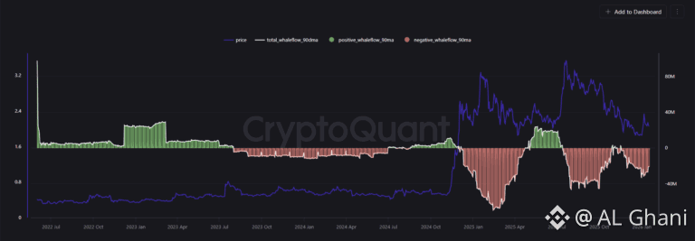 Further reinforcing the cautious outlook, the XRP Whale Flow 30-day moving average has remained in negative territory even during the recent price rebound. This suggests that distribution by large holders is still underway.