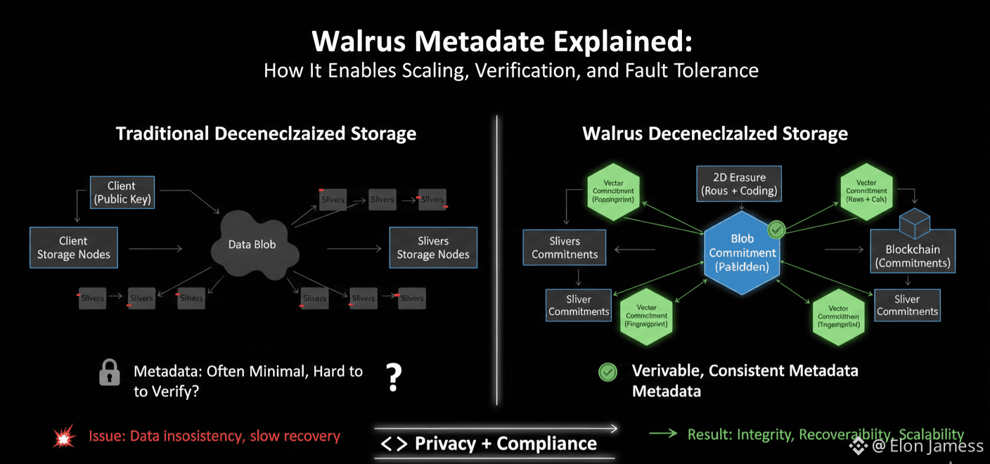 In decentralized storage systems, metadata is just as important as the actual data. People often focus on blobs because that is where the content lives. But metadata tells you what the data is, where it is stored, and how it can be checked and recovered. In Walrus, metadata is treated as a core part of the system. It is designed to support scaling, verification, and fault tolerance without creating any central control points.