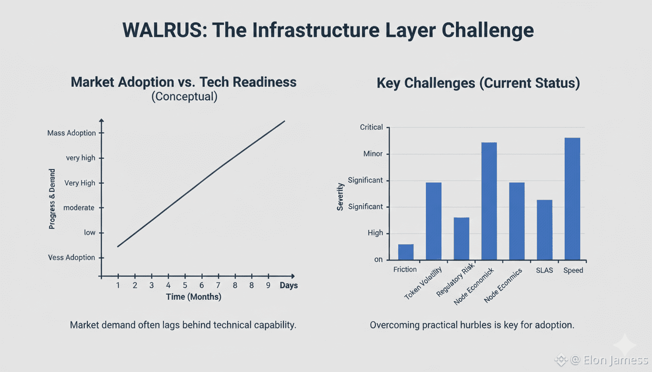 What worries me most though is not even regulation or token volatility. It is relevance. Walrus is solving a real problem but it is solving it for a market that barely exists yet. Most Web3 apps do not need massive storage. Most AI companies will not trust critical datasets to a network they do not control. Enterprises want SLAs not cryptographic proofs. Walrus is building for a future that might arrive or might never quite materialize.
