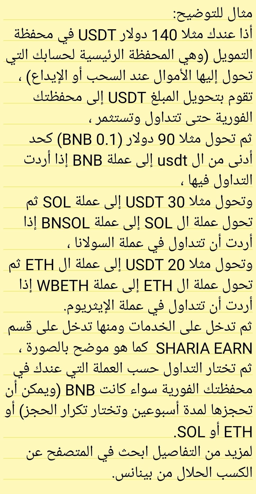 إذا كنت ترغب في حجز أموالك لمدة أسبوعين أو أكثر فعليك التحويل إلى عملة $BNB ثم الدخول إلى earn #Sharia من بينانس وحجز عملتك.