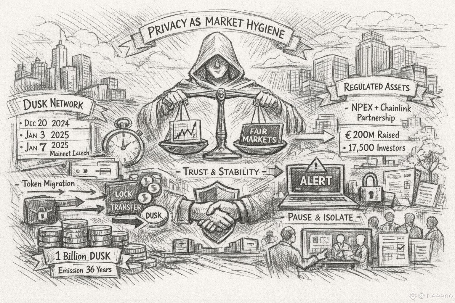 When you put these updates together—the mainnet timeline becoming real, the long-horizon emission model, the migration mechanics designed to reduce ambiguity, the incident response that prioritized containment, and the regulated-market partnerships—you start to see what “fairness” means inside Dusk. It’s not a moral claim. It’s a systems claim: fairness is what emerges when the incentives discourage surveillance, the verification pathways reduce panic, and the default user experience doesn’t punish people for needing confidentiality.