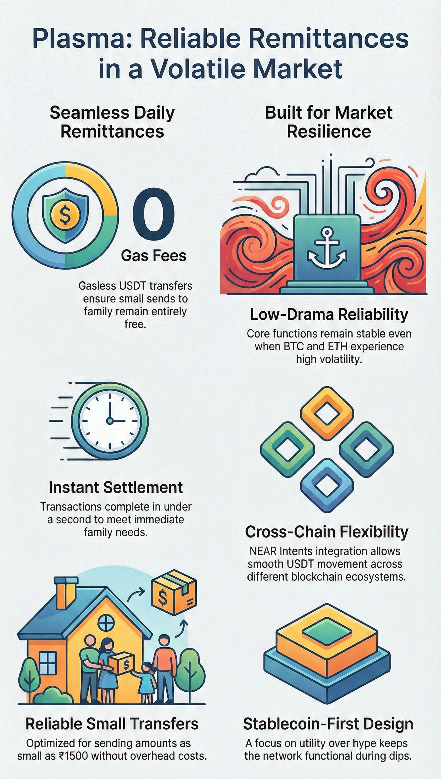 That quiet reliability feels rare right now. Markets are shaky BTC and ETH swinging hard plenty of chains showing stress but Plasmas stablecoin first design keeps its core promise intact: send money home without thinking about gas or delays. Last week I sent about ₹1500 worth of USDT. Zero cost. Under a second. In places where pocket money is tight and my own needs dont wait for market recoveries that reliability matters more during a dip than during a pump.
