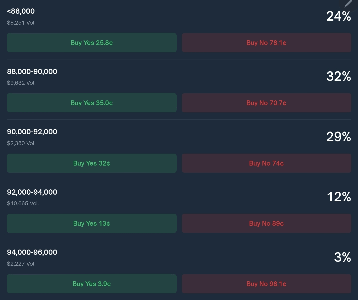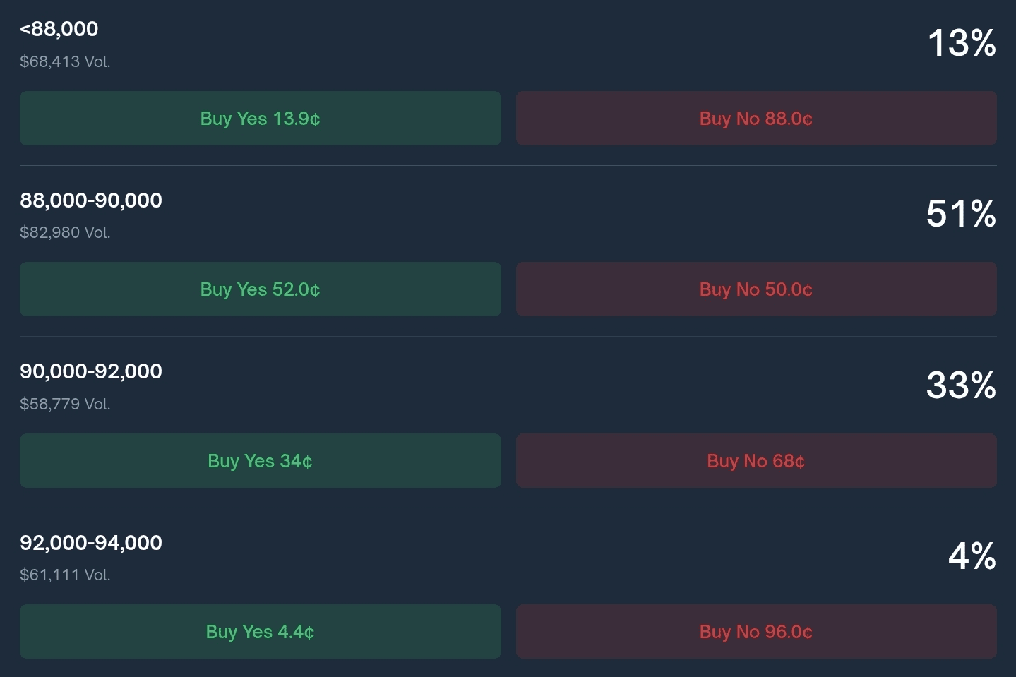 📍Прогноз большинства в Polymarket на сегодняшний и на завтрашний день даёт нам наиболее вероятный разброс цен 88-90k с дальнейшим уклоном к снижению.