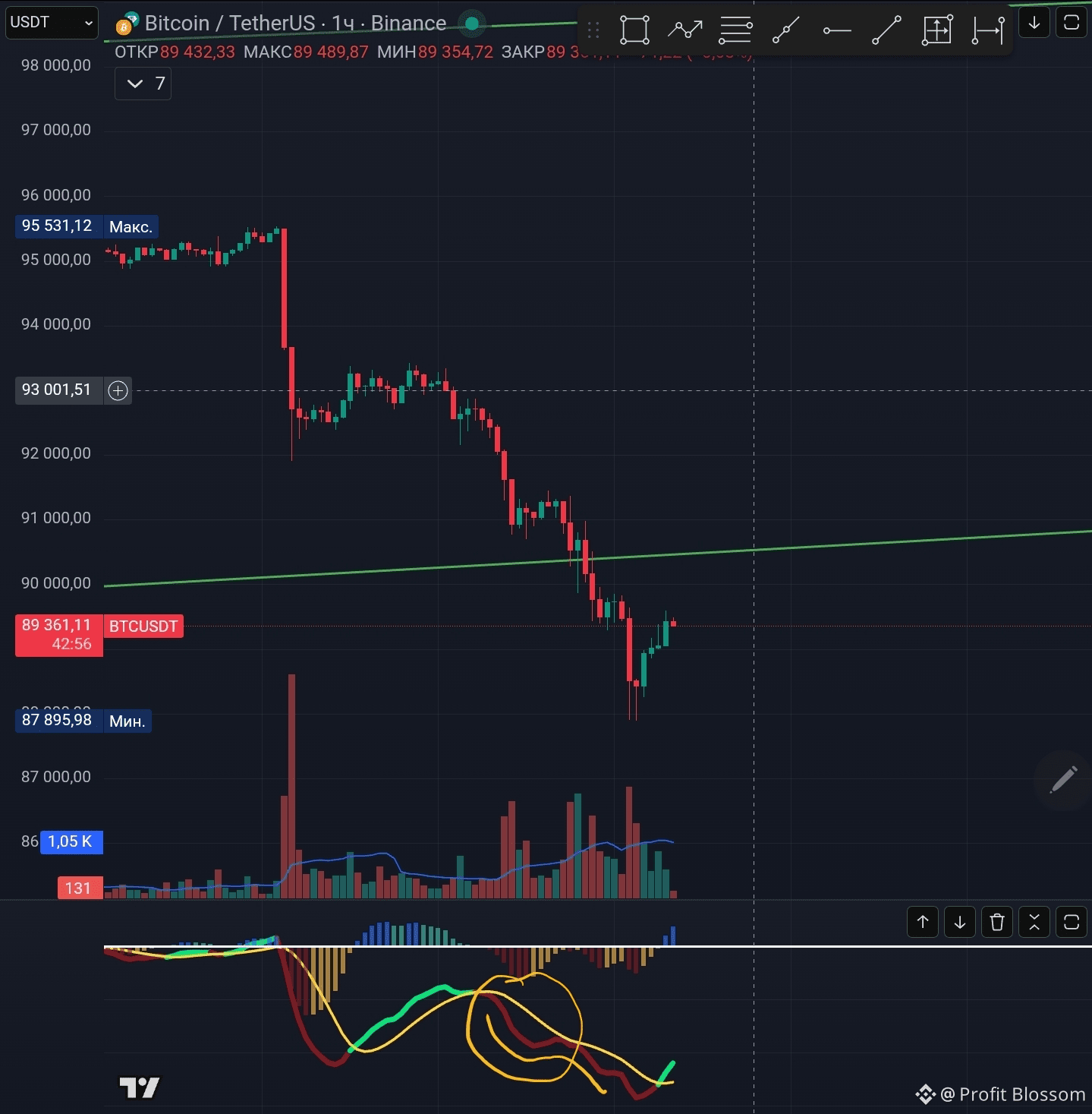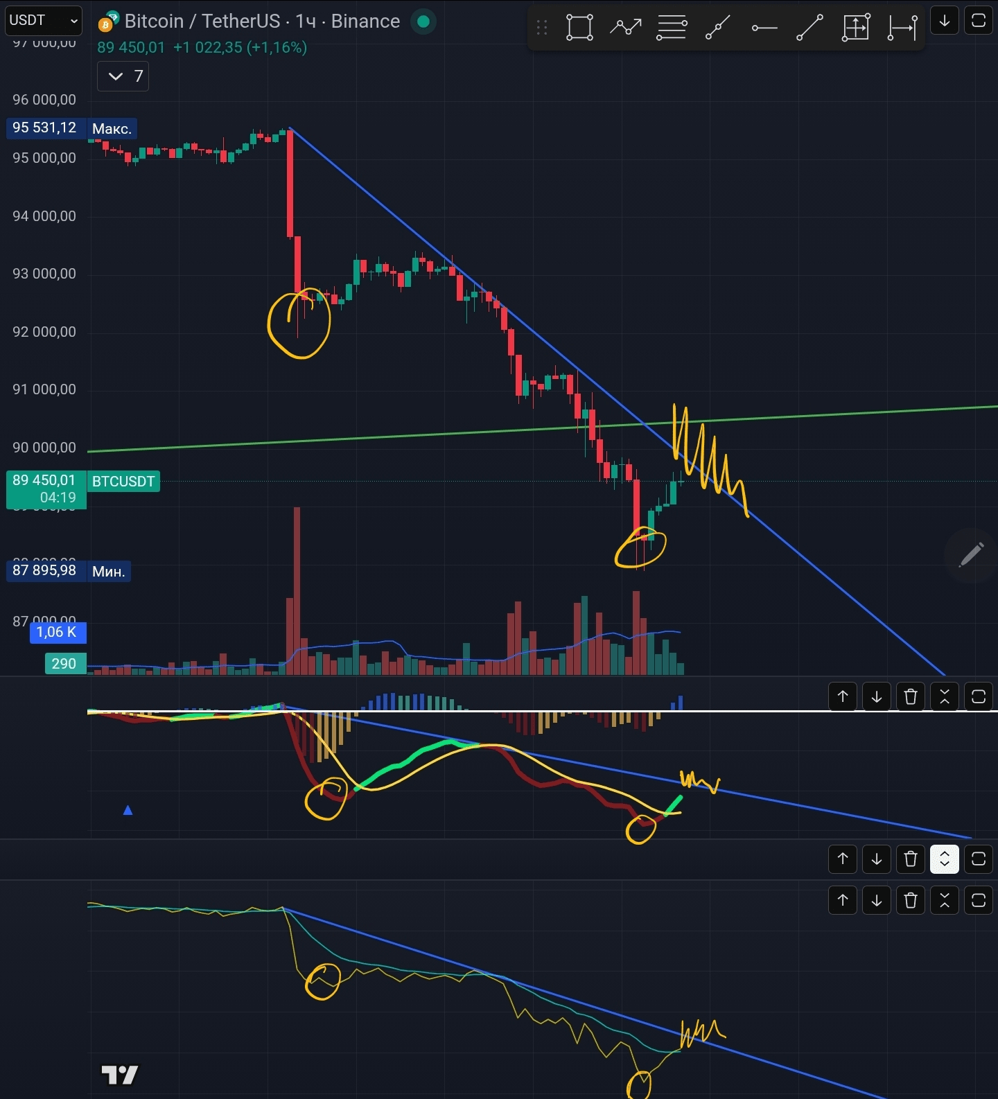 Доброе утро дорогие друзья, сначала хочу посвятить первую часть разбору своей вчерашней ошибки. Неуверенный отскок цены от линии сопротивления я посчитал за новый лой, когда нужно было дождаться хотя бы отскока до красной линии Фибоначчи. MACD только начал формирование своего Лоя но после провала цены данный Лой превратился в нисходящую линию.