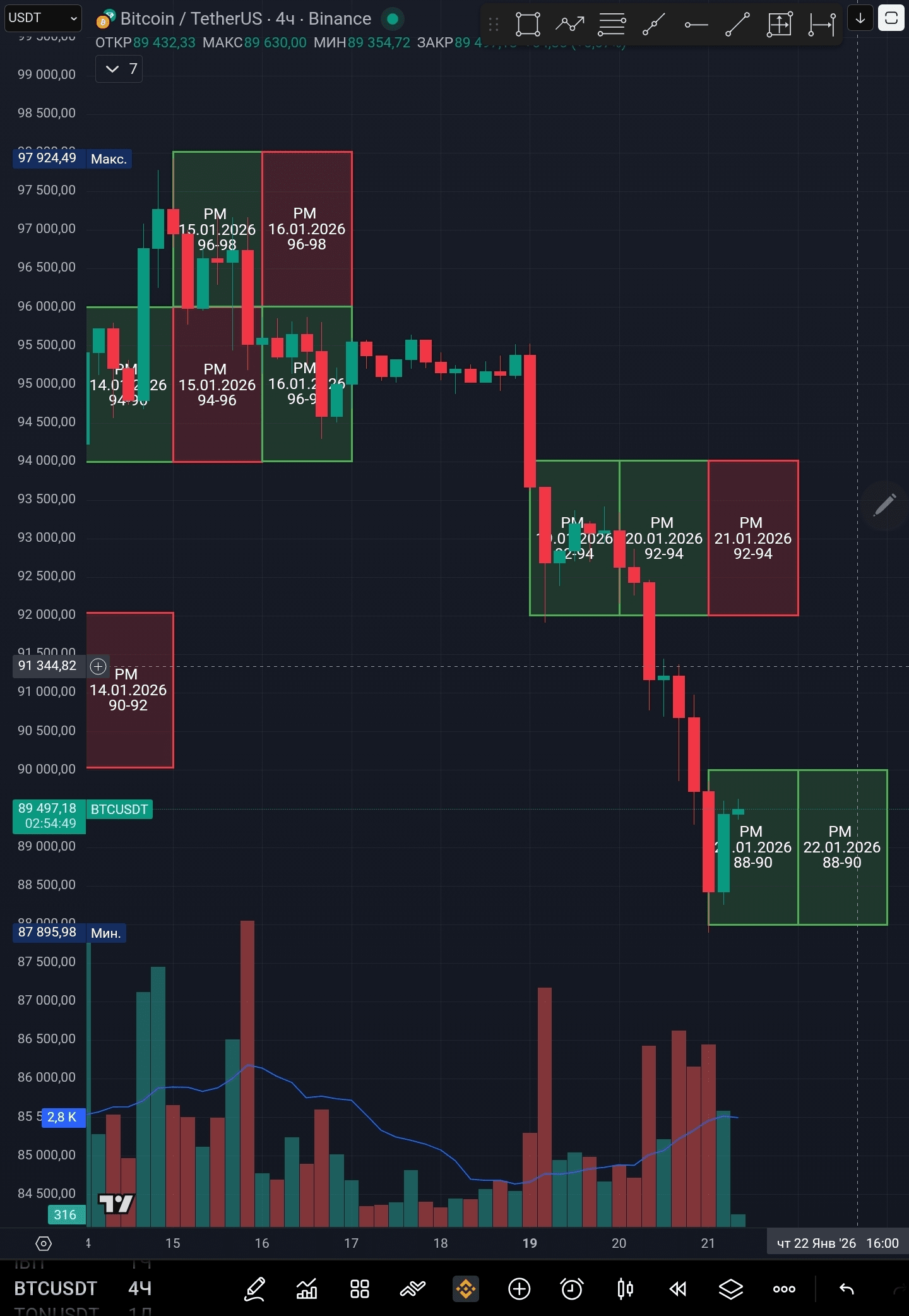 📍Вывод для себя я делаю следующий: буду ждать подтверждения цены нисходящего движения путём ретеста линии сопротивления восходящего клина. Нужно будет внимательно следить за тем, что будет говорить Трамп на экономическом форуме в Давосе, подозреваю, что там будут обговаривать в основном Гренландию и тарифные меры, на фоне этого может начаться волатильность. Многие будут следить за тем, в какой риторике будет говорить президент соединенных штатов и так будут отвечать лидеры Европейского союза.