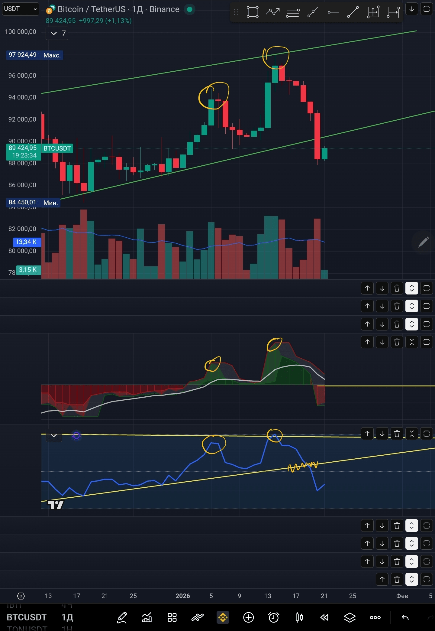Индекс силы вошёл в минусовую зону, RSI пробила свою восходящую прямую линию. Но нужно дождаться ретеста, так как эти два индикатора показывают восхождения свой своих хаев, подтверждающих рост восходящих волн цены, будто движение вверх ещё не закончилось, и сейчас только коррекция локального восходящего тренда.
