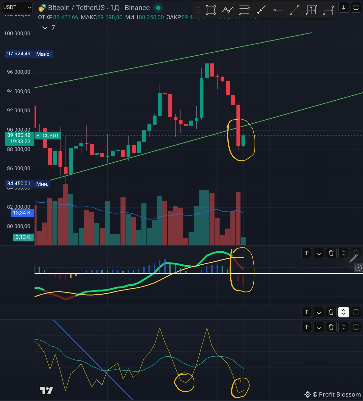 📍 На дневных графиках цена закрылась ниже линии поддержки фигуры продолжение среднесрочного медвежьего тренда Восходящий Клин. Пока ещё рано говорить о том, что можно становиться в короткую позицию, нужно дождаться ретеста цены о пробитую линию поддержки, ставшую нынешней линией сопротивления. Ретест даст нам понять, надёжно ли ушла наша цена вниз, или же хочет сделать ещё одну восходящую волну. Быстрая скользящая средняя индикатора MACD круто пересекла медленную скользящую, свечи индикатора ушли в минусовую позицию. Индикатор баланса объёма нарисовал новый лой, подтверждающий движение цены вниз.