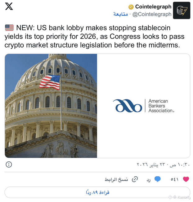 تضع جماعات الضغط المصرفية في الولايات المتحدة وقف عوائد العملات المستقرة على رأس أولوياتها لعام 2026. وتسعى رابطة المصرفيين الأميركيين (ABA) إلى دفع الكونغرس لحظر الفوائد أو المكافآت أو حتى مدفوعات العائد على العملات المستقرة المخصّصة للمدفوعات.