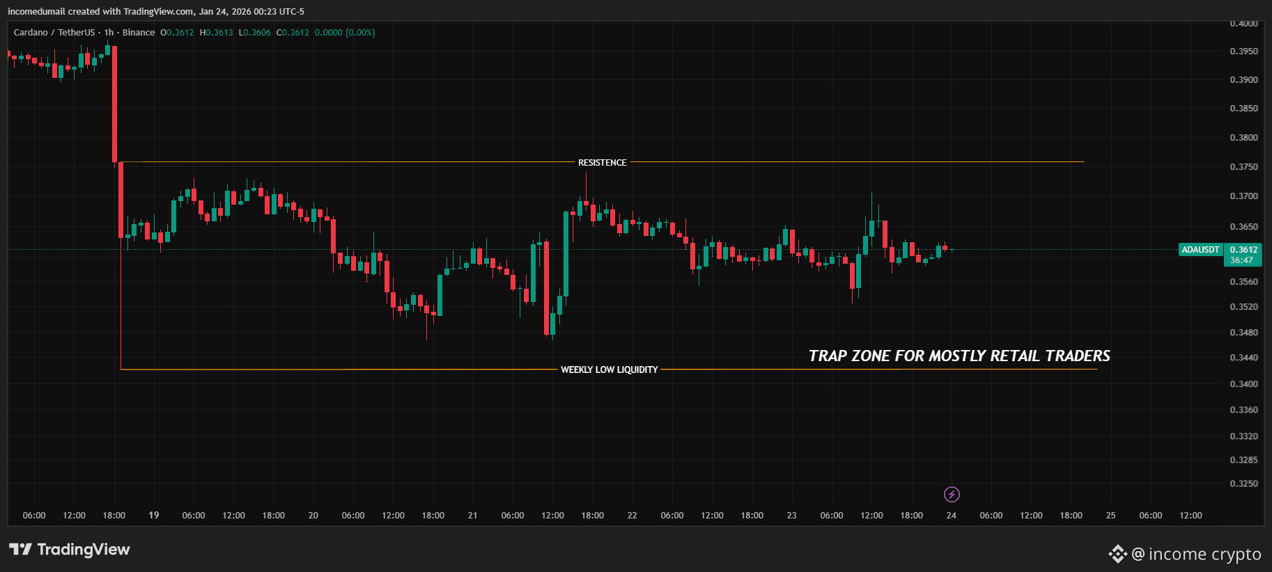 Current price (~0.361) is dead center of the range, which is the worst possible location to take directional trades.