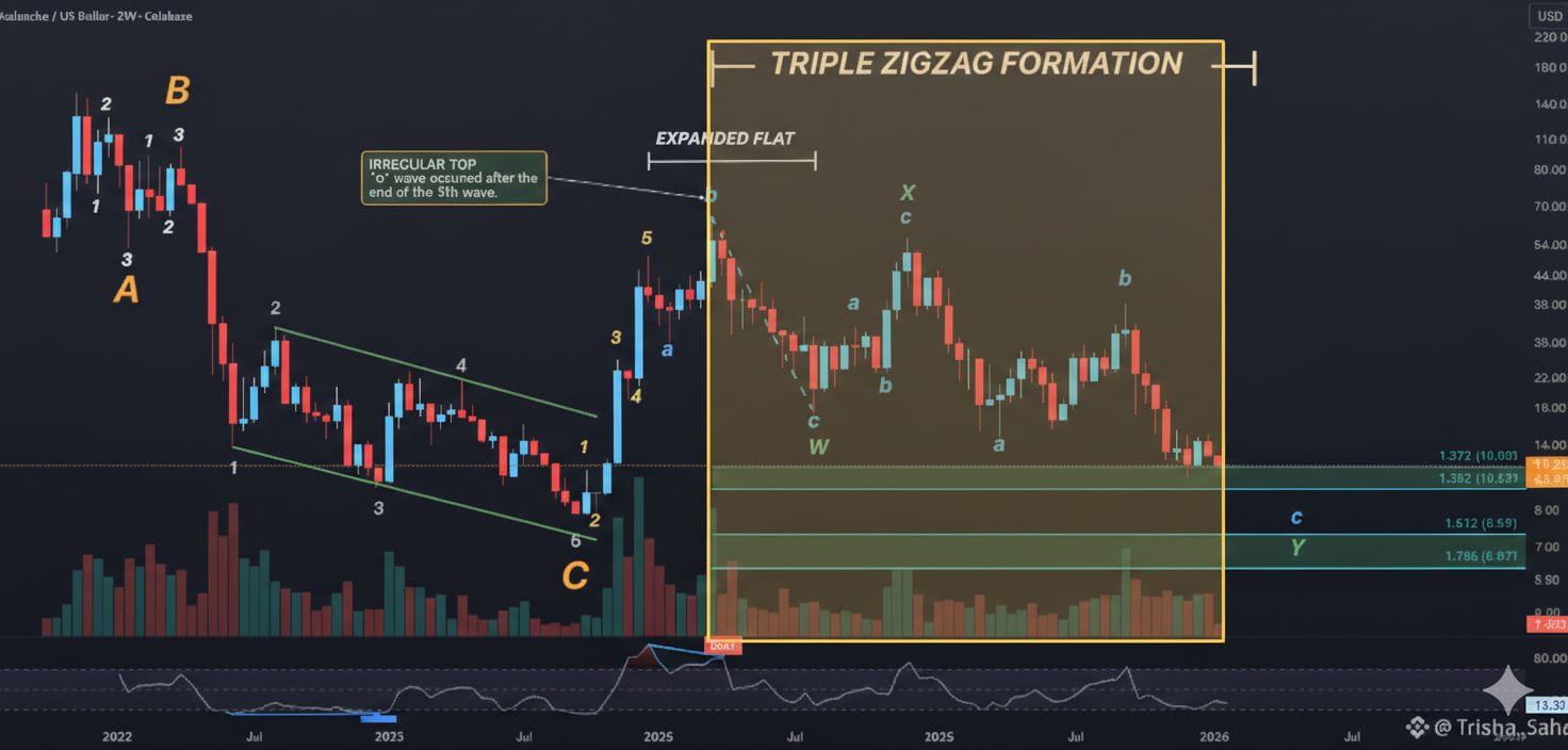 $AVAX may be forming a Triple Zig-Zag ā three connected ABC corrective patterns ā which places emphasis on expansion targets around 1.272 and 1.618 relationships from previous legs of the structure (such as the āWā wave Ć 0.618).