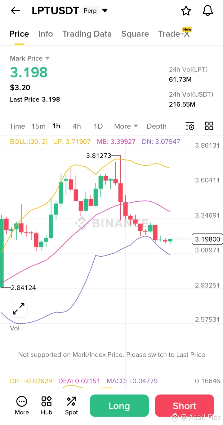 $LPT is currently under pressure on the 1H chart, trading at $3.198 with a -7.00% drop today. After a rejection from the $3.81 level, the price is now testing the lower Bollinger Band.