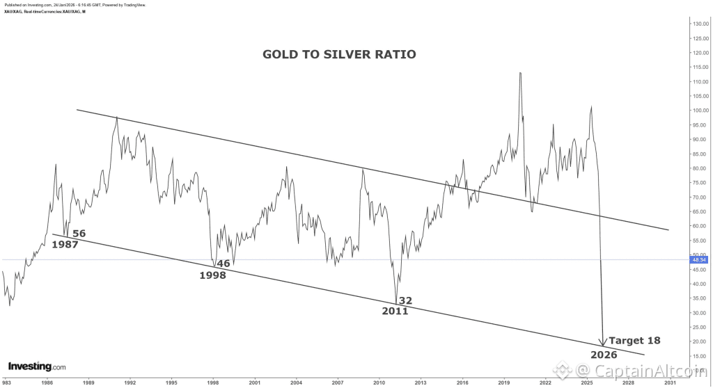 In previous cycles, major silver peaks have coincided with the ratio falling into the 30s or even low 30s. A move toward 18 would signal extreme silver outperformance versus gold.