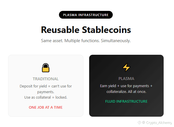 @Plasma looked at this differently. What if stablecoins could do multiple jobs simultaneously? What if the same dollar could be collateral, payment rail, and yield source without being locked into one function?