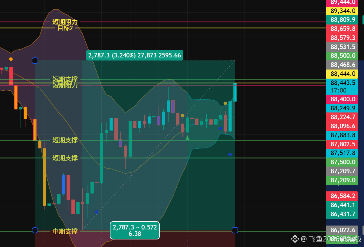 89,400 - 89,500:核心阻力。之前跌破的箱体底部,也是“W底”突破后的理论涨幅目标位(87.2k到88.5k的等距映射)。