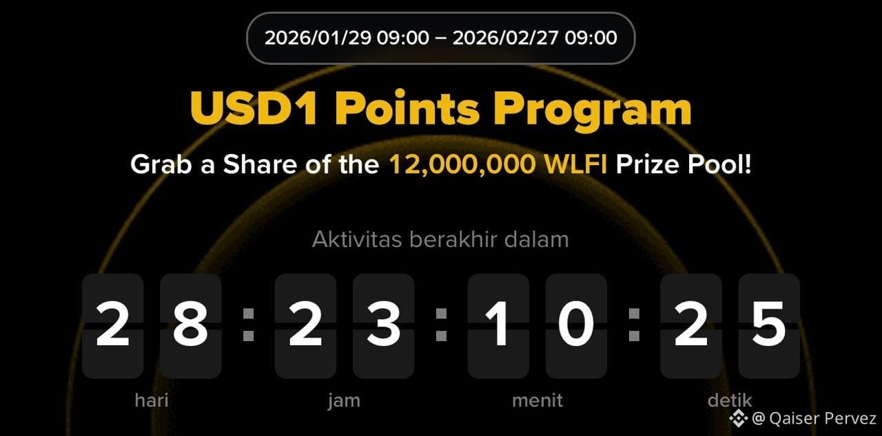 #he image highlights the launch of the USD1 Points Program, a limited-time rewards campaign designed to incentivize user participation with a massive 12,000,000 WLFI prize pool. Running from January 29, 2026, at 09:00 to February 27, 2026, at 09:00, the program introduces a points-based system where participants can accumulate rewards and compete for a share of the total prize allocation.