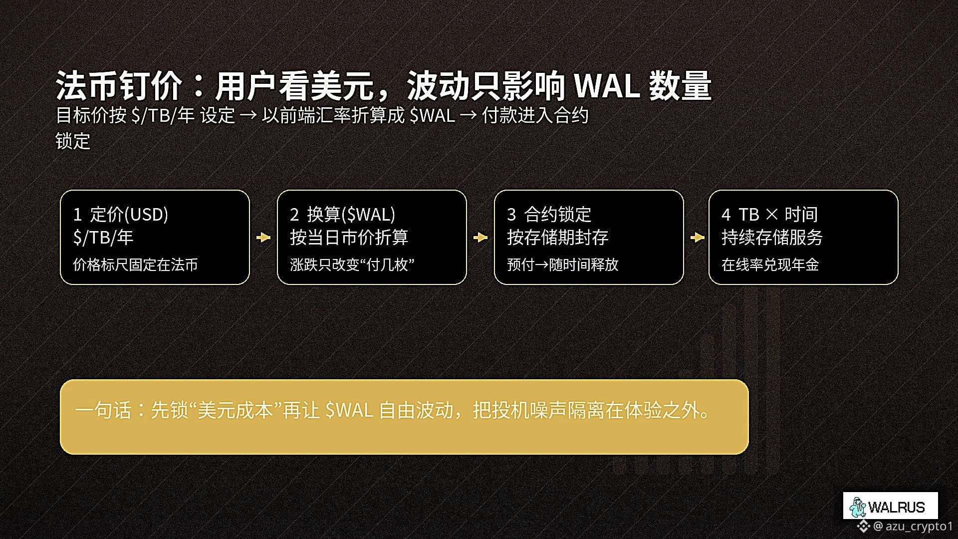 也正因为这个背景,当我把 Walrus 的资料、尤其是 $WAL 的经济设计翻了好几遍之后,会有一种“这货干了点真反人性的东西”的感觉。Walrus 从一开始就不是先问“ WAL 能不能涨成下一个百倍 DePIN”,而是先写死一条对投机者极不友好的约束:用户看到的存储费用,要尽量钉在法币标尺上,WAL 自己爱怎么波动怎么波动,但不能反过来折腾真实用它的人。官方的 token 页面和 GCR 那篇长文都反复强调,WAL 是存储支付代币,但支付机制的设计目标是“让存储成本在法币视角下保持稳定,隔离长期的代币价格波动”。
