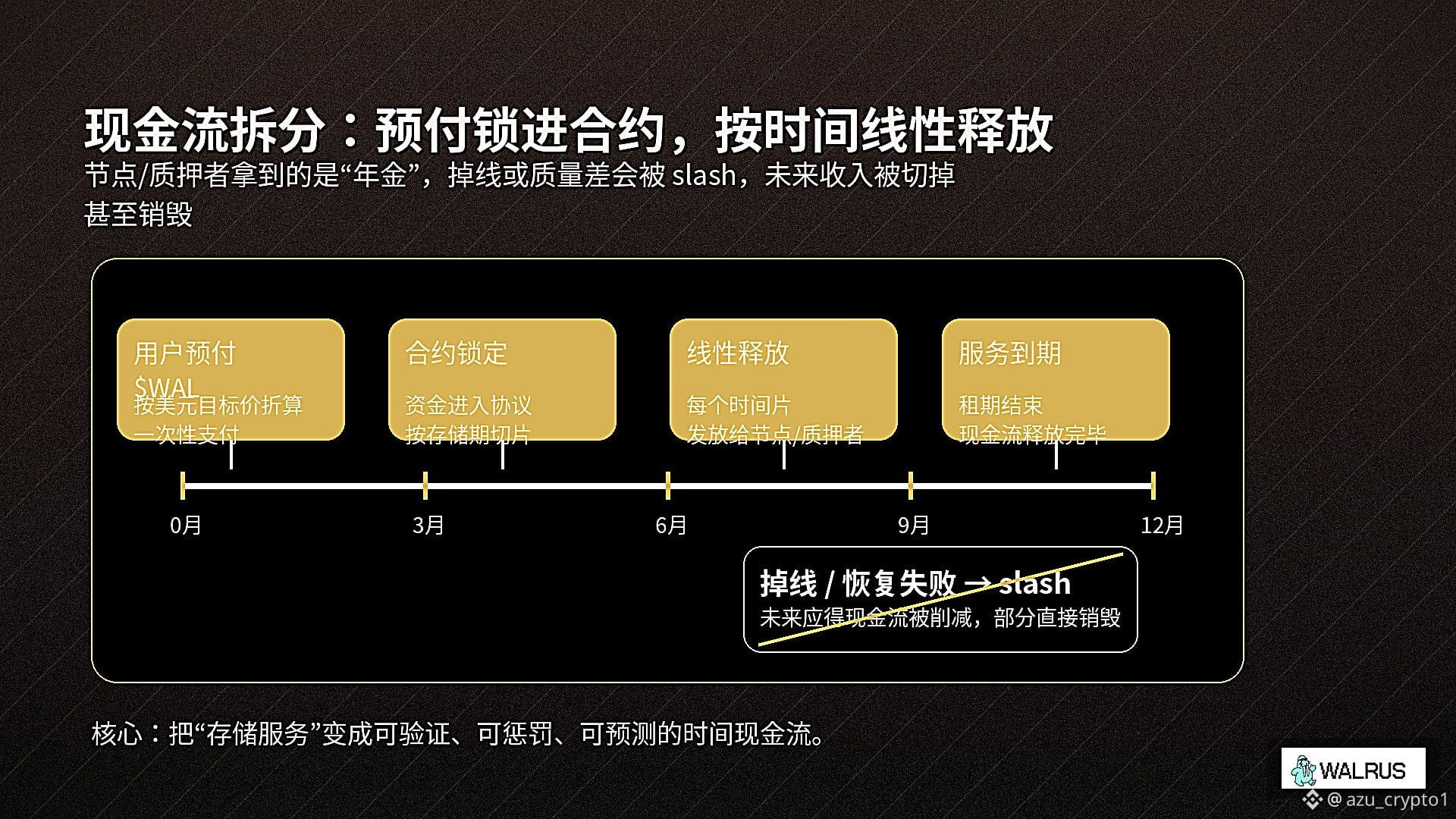 更有意思的是,用户这笔钱付出去之后,并不是直接进了节点的兜里。GCR 文里和白皮书都讲得很清楚:你在 Walrus 上买的不是“一次性服务”,而是一串跟时间强绑定的现金流。你为 100TB、12 个月预付的那一笔 $WAL,会被锁进协议合约里,沿着整个存储期,被缓慢释放给真正扛着数据的存储节点和质押者;谁中途掉线、谁服务质量不过关,后面本该属于 TA 的那部分未来收入,就要被 slash,甚至直接销毁。对节点来说,这不再是一门“打一枪就跑”的挖矿生意,而是一串必须靠长期在线率和恢复能力来兑现的年金;对拿 WAL 去质押的持币人来说,你买的也不只是通胀分配,而是一张“跟链上 TB×时间挂钩的收益凭证”。