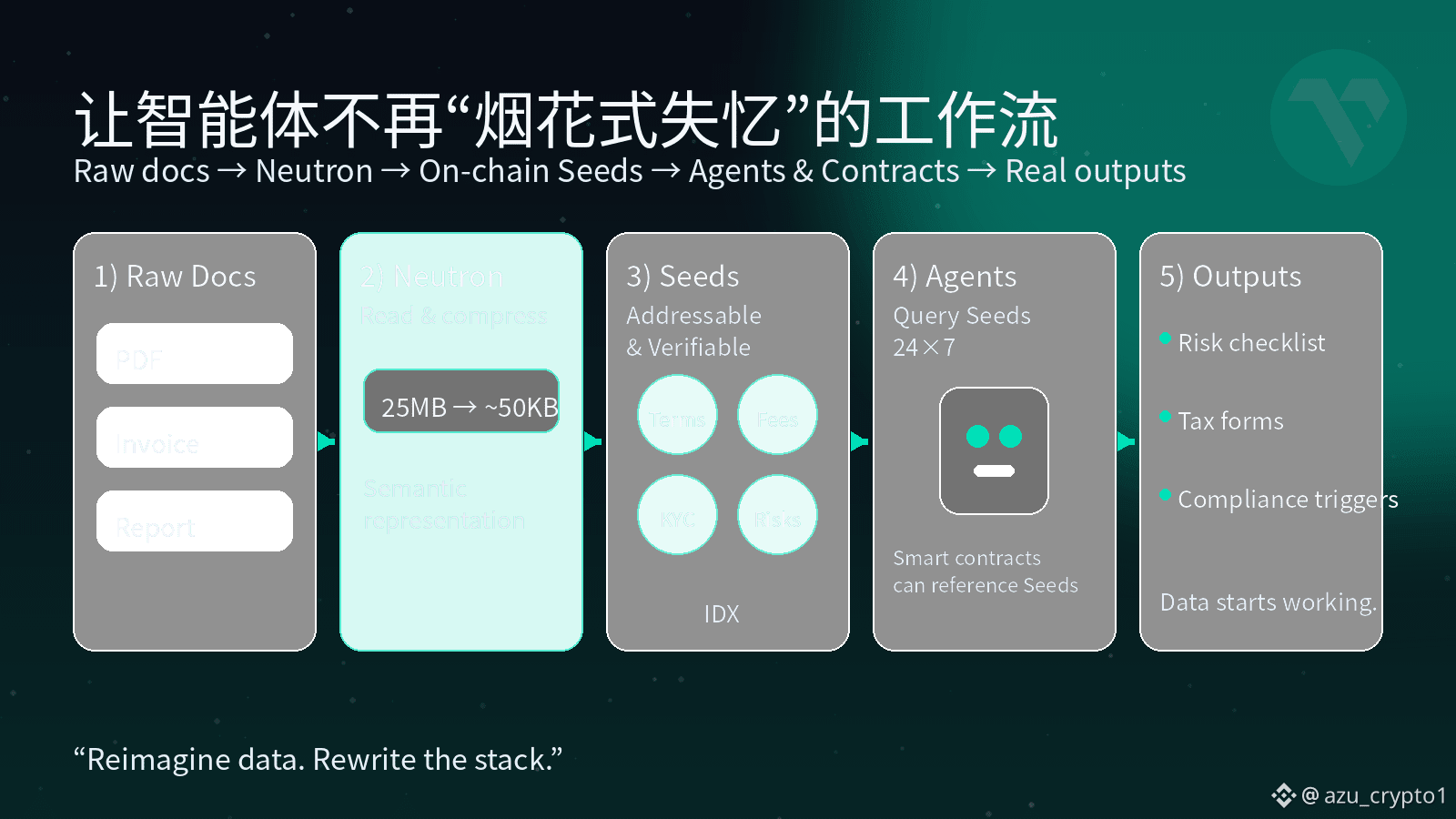 更有意思的是,Seeds 不是某个 App 的私有格式,而是整个 Vanar 栈的公共语言。你在 myNeutron 里生成的一颗知识 Seed,未来可以被其他 Vanar 生态应用,甚至被 Kayon 这样的链上推理引擎直接读取和调用;记忆不再属于某个应用,而是属于你,也属于这条链。Vanar 那句“Reimagine data. Rewrite the stack.”就体现在这里:数据不再只是被动地“活着”,而是真正开始“工作”。在 Neutron 之前,链上的绝大多数数据都是死账,一笔笔交易,一个个哈希;在 Neutron 之后,被压进 Seeds 的文件,会持续为 AI 和合约提供上下文,而不是静静躺在冷存里吃灰。