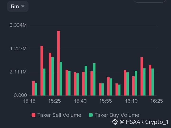 âđŽ Selling Dominance: Taker Sell Volume is consistently outweighing Buy Volume on the 5m timeframe. This confirms that sellers are hitting the bids aggressively, driving the price lower with high conviction.
