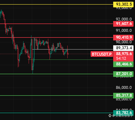 如果夜间上不去89370上方,那说明小级别反弹没有力度,再次回踩下方支撑位留意87200-85320-83800这几个位置附近!#BTC走势分析