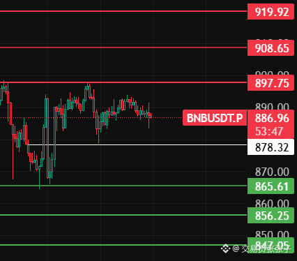 如果夜间突破不了横盘区的顶,那就留意横盘区的底878,不破顶底继续走横盘,破了横盘区的底那就要继续下探,下方支撑位留意865-856-847这几个位置附近!#BNB走势