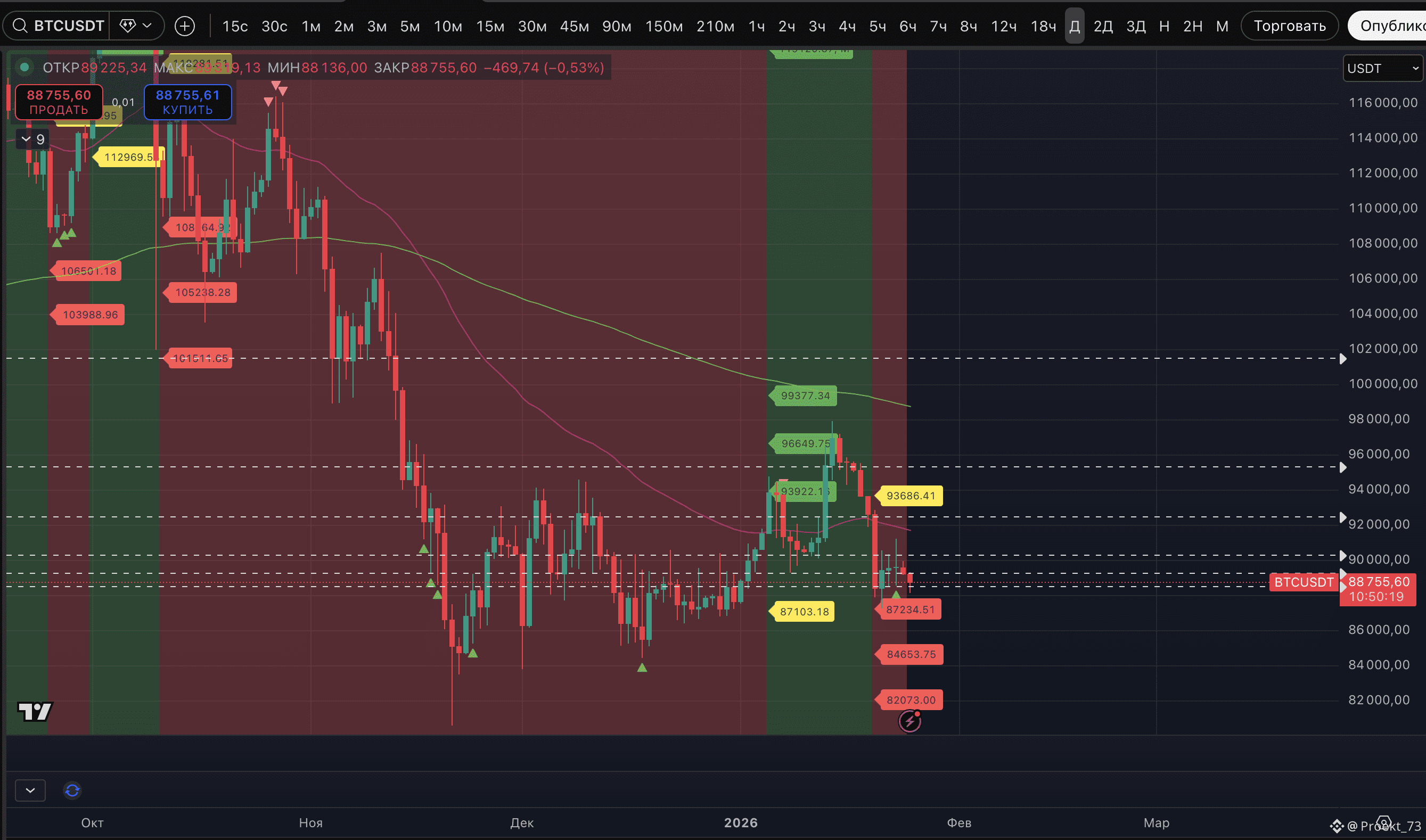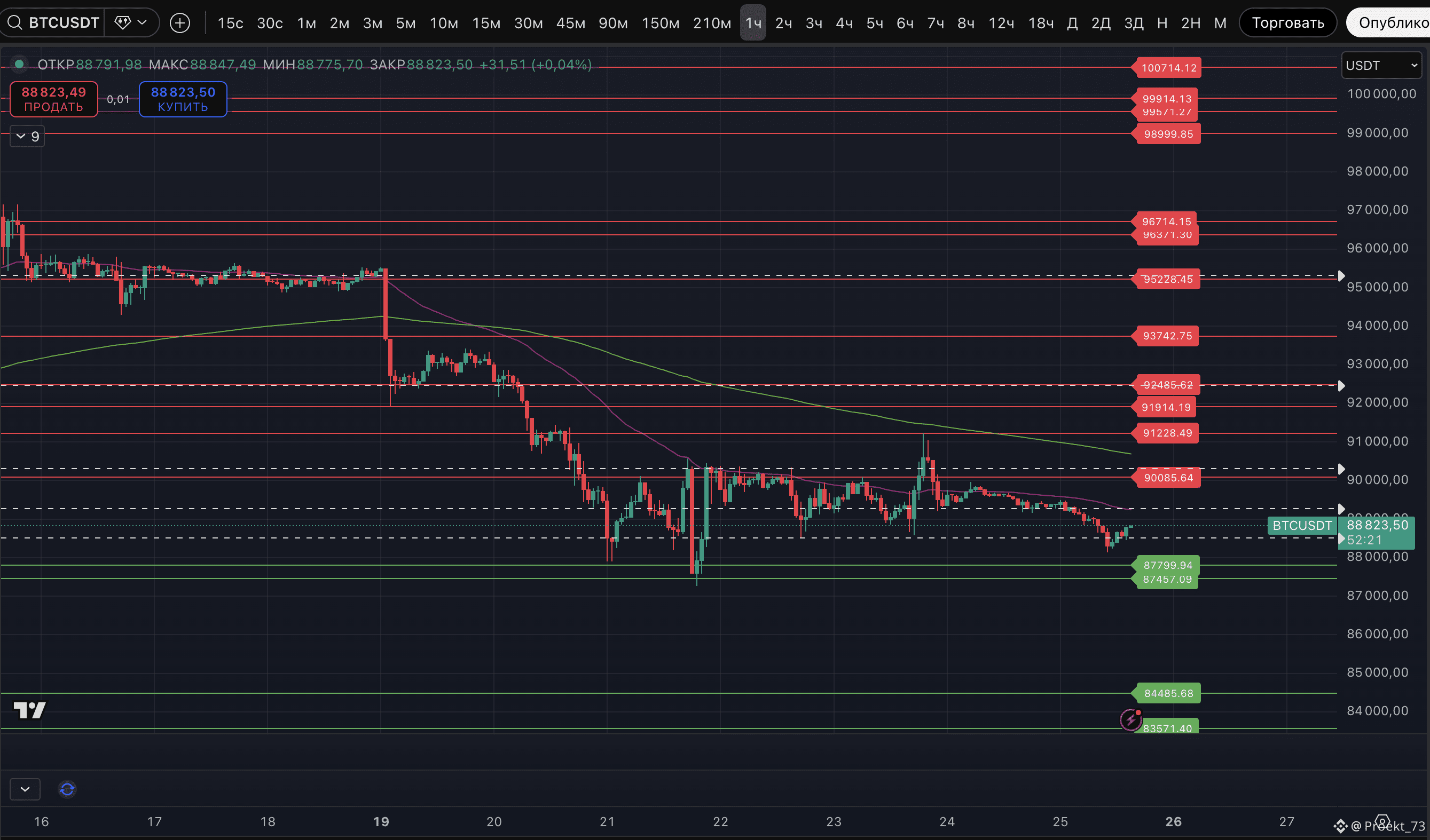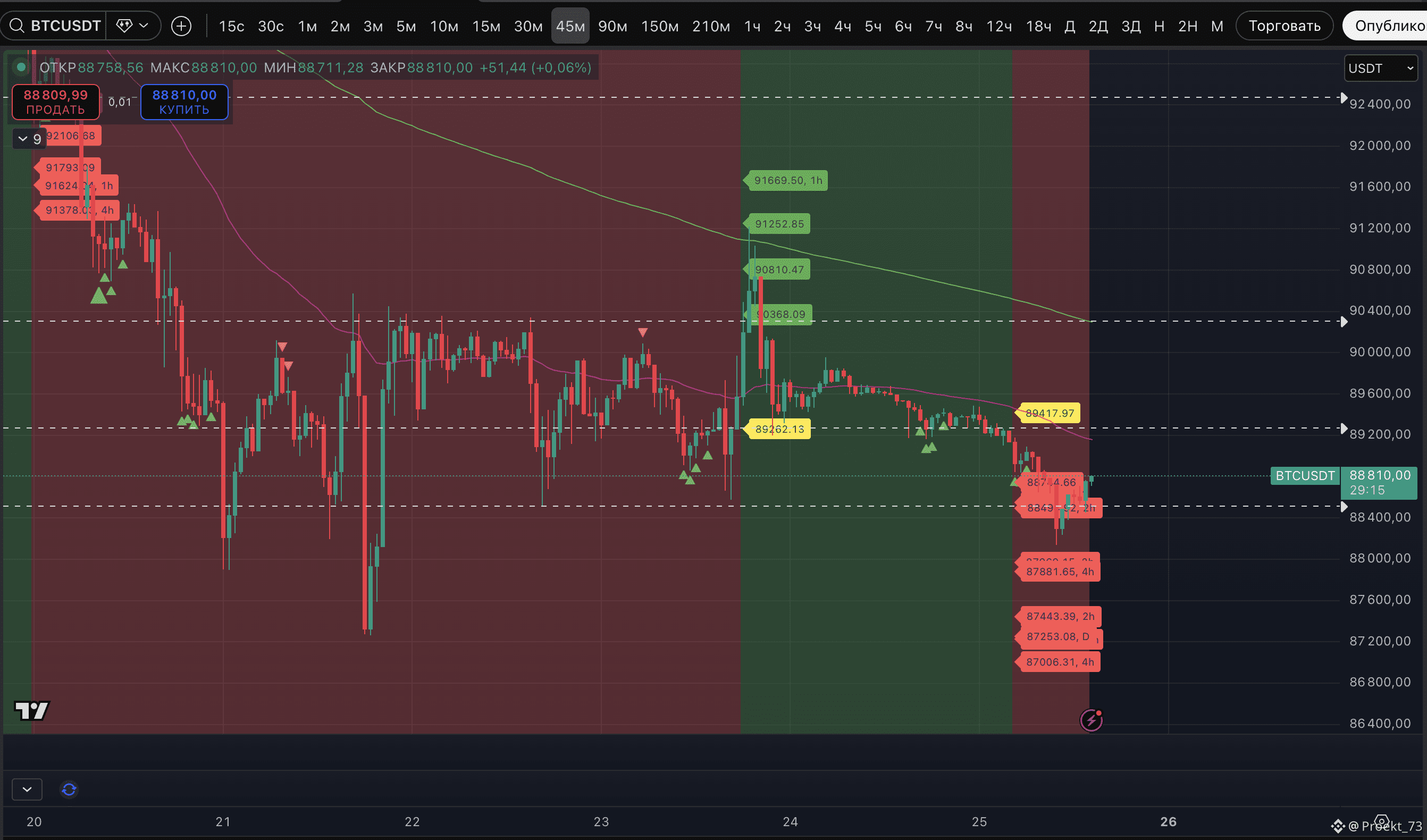 Как видно по скринам, базовые цели снижения уже и отработаны на 45-минутном и часовом ТФ. На 1,5-часовом ТФ еще не отработана последняя цель - 87 861$.