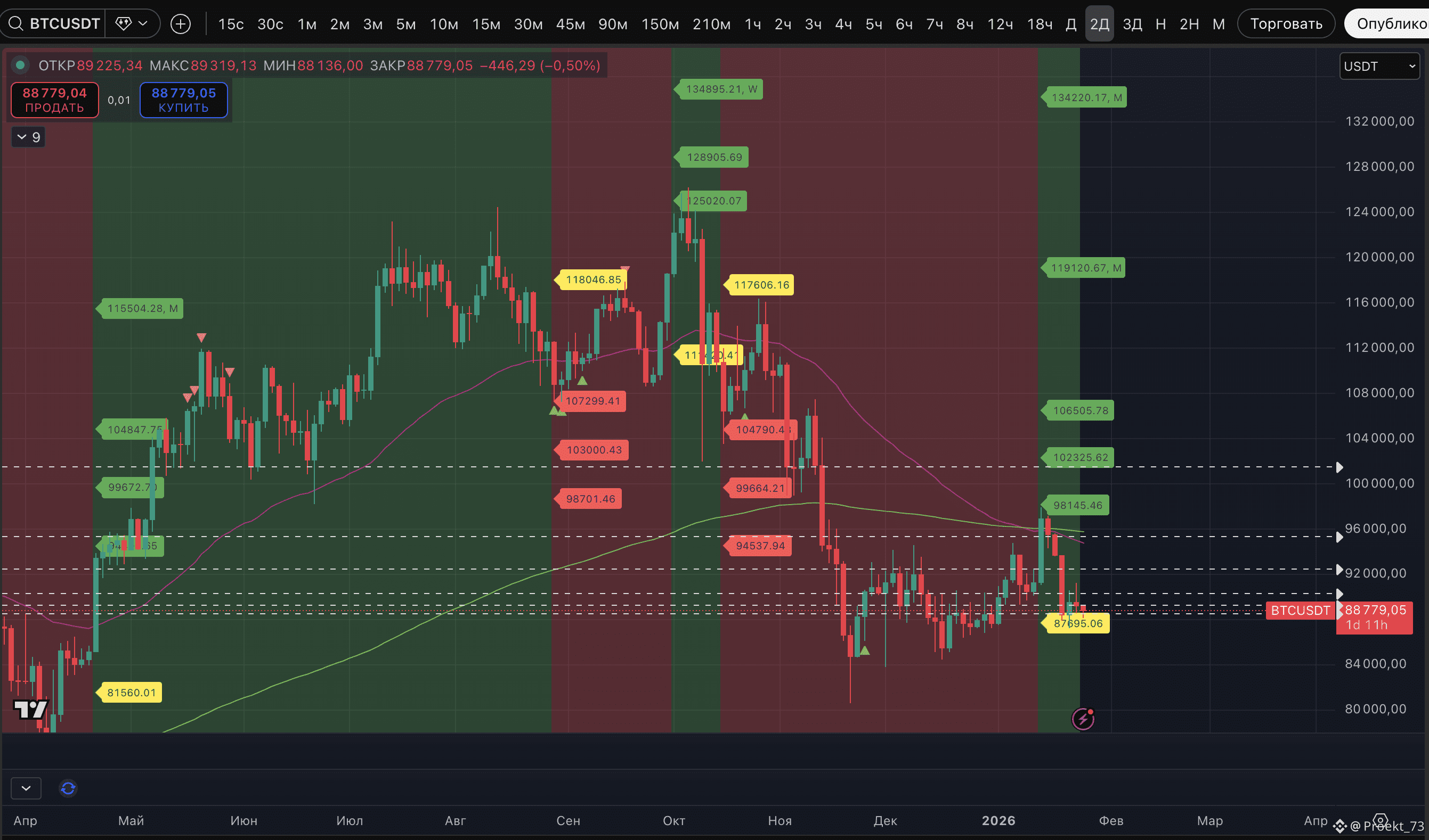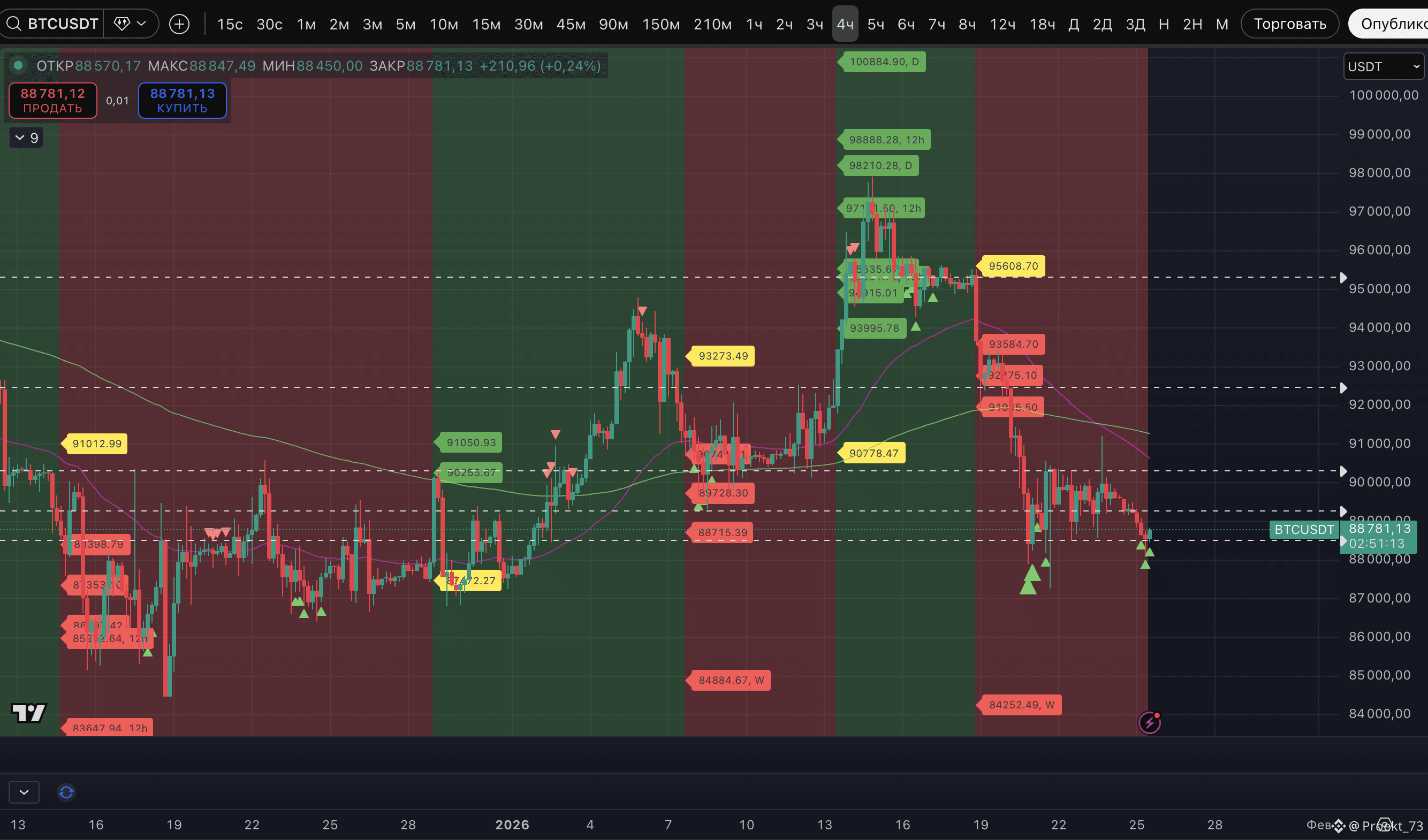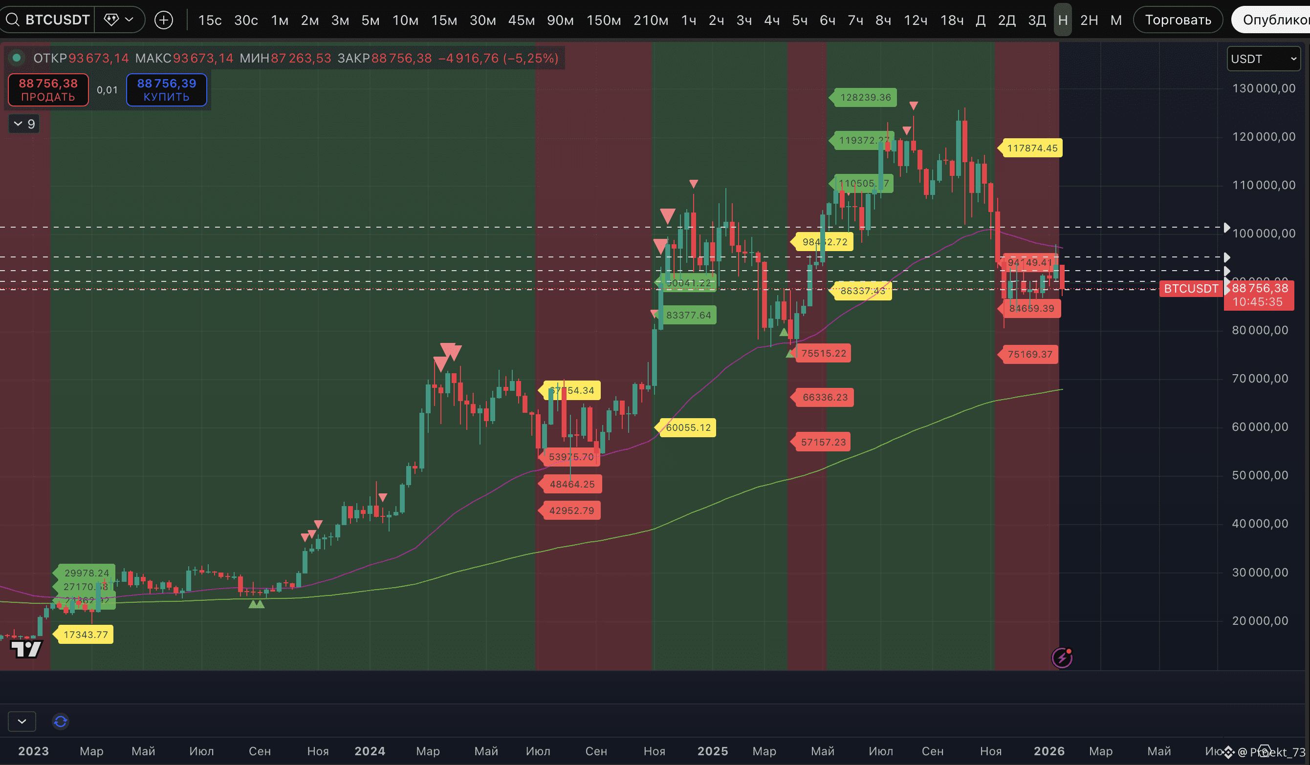 - Собственно, сами метки потенциального лоя по нашему индикатору на BTC и ряде других активов. И не только на 4-часовом ТФ. Также они есть на часовом ТФ 1,5-часовом, 2-часовом, 3-часовом ТФ.