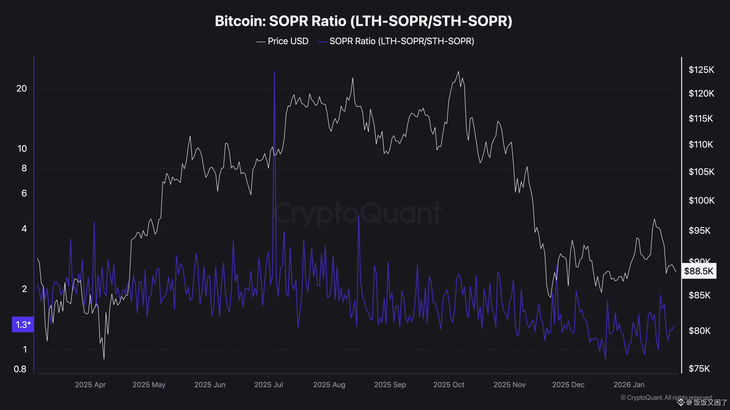 通过观察 LTH SOPR 与 STH SOPR 的比率可以发现,该指标目前约在 1.3 左右,处于历史区间的下限。