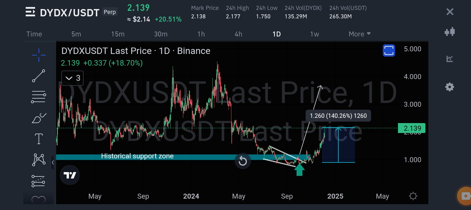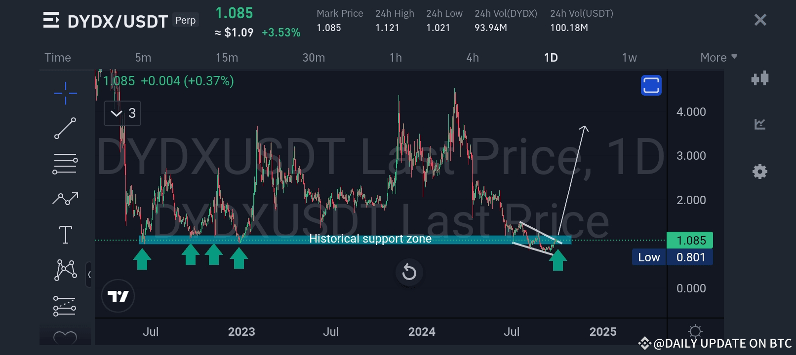 Vài ngày trước, tôi đã chia sẻ một phân tích chi tiết về DYDX/USDT. Biểu đồ làm nổi bật Vùng hỗ trợ lịch sử, một mức đã được tôn trọng nhiều lần trong quá khứ, như được thể hiện bằng các mũi tên màu xanh lá cây.