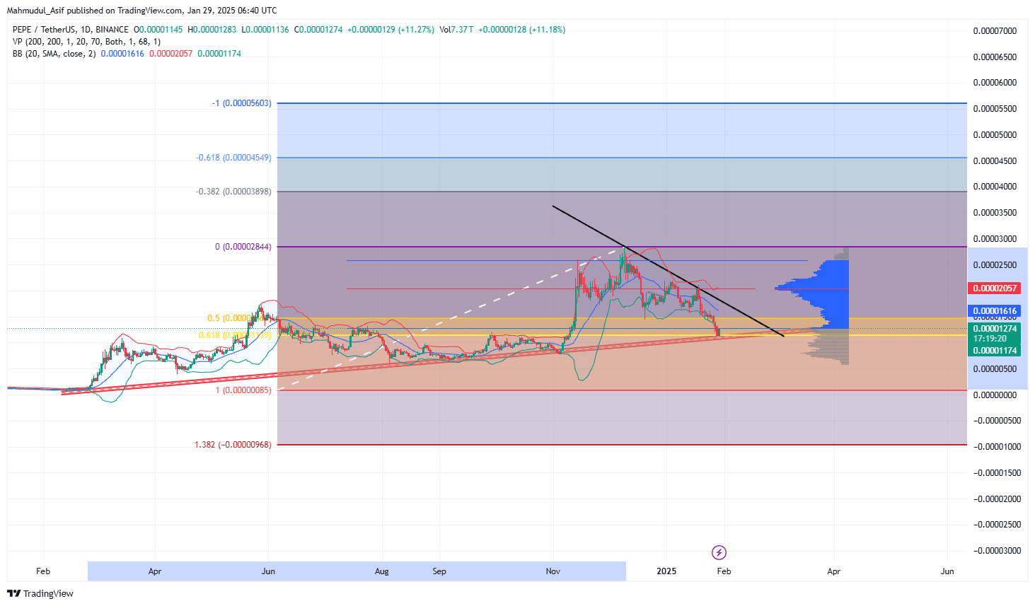 Nếu chúng ta thấy biểu đồ này trong khung thời gian hàng ngày, chúng ta thấy một đường hỗ trợ lớn từ 340 ngày trước đến những ngày hiện tại. Nếu chúng ta đo lường đồng tiền này, chúng ta thấy một đợt tăng giá 4000%. Và chúng tôi tập trung vào đợt tăng giá, fibonasis golden pocket của chúng tôi hỗ trợ đợt tăng giá. Và chúng tôi nghĩ đây là nơi an toàn để mua đồng tiền pepe. Nhưng nếu bạn hướng đến tương lai thì phải đặt đòn bẩy từ 5 đến 8% vì thị trường hiện tại là biến động nên nếu bạn giao dịch một cách mù quáng, cuối cùng bạn sẽ mất tiền. VÌ VẬY, hãy theo dõi tôi dưới sự hướng dẫn của tôi, bạn có thể thấy được lợi nhuận lớn.