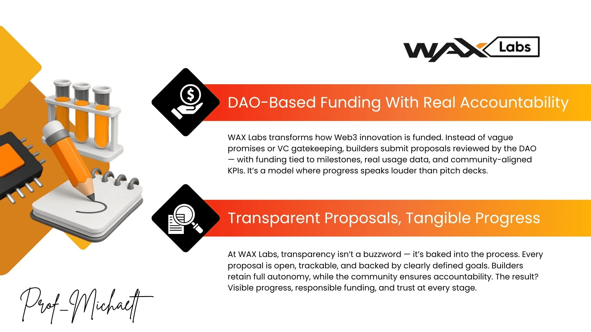 Khác với các hệ thống tài trợ truyền thống hoặc các đường ống đầu tư mạo hiểm, WAX Labs hoạt động dưới mô hình tài trợ do DAO dẫn dắt. Mỗi đề xuất đều được xem xét với lợi ích của cộng đồng trong tâm trí, được hỗ trợ bởi các khoản thanh toán dựa trên cột mốc và gắn với các sản phẩm rõ ràng.