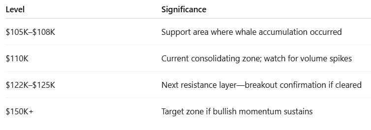 Trong ngắn hạn, BTC đang củng cố trên $110K. Khu vực kháng cự tiếp theo nằm giữa $122K–$125K, với một sự bứt phá tiềm năng mở ra một đợt tăng mới hướng tới $150K–$200K.