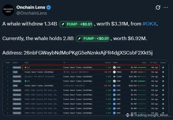 Theo Onchain Lens, một cá voi vừa rút 1.34 Tỷ PUMP (trị giá 3.31 triệu USD) từ sàn O.K.X.