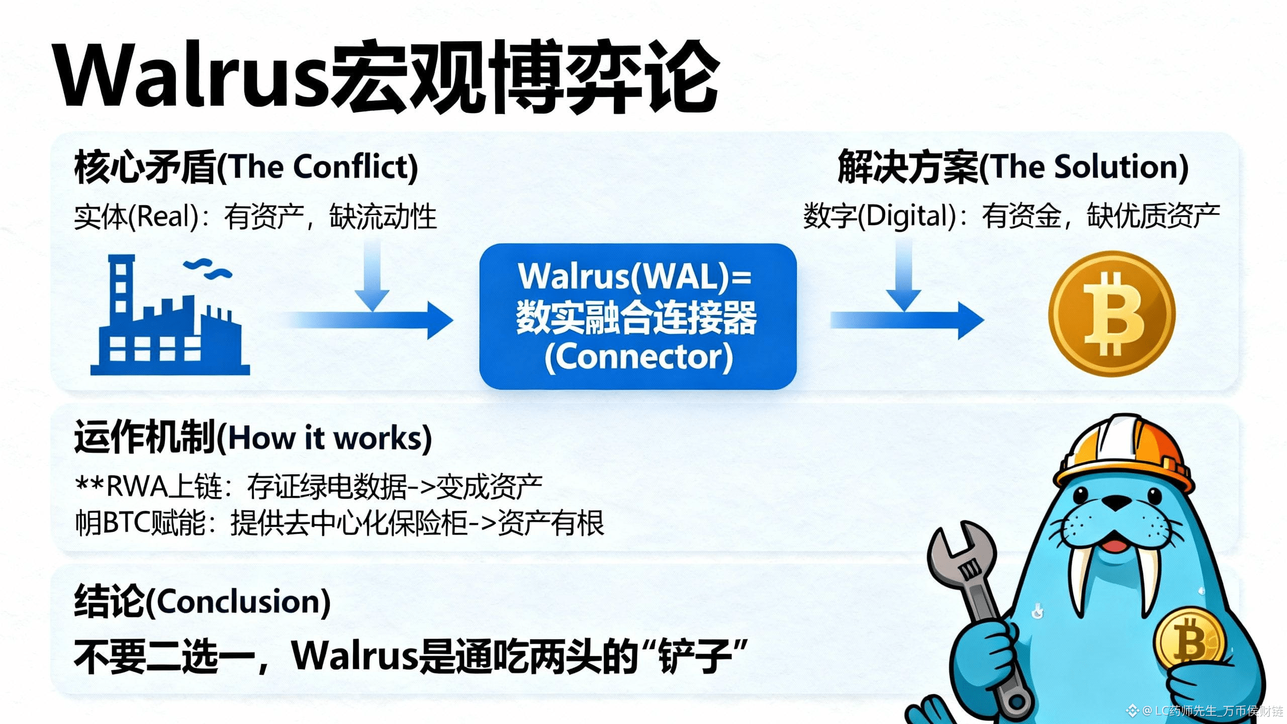 真正的未来,既不是单纯的挖煤发电,也不是虚无的链上炒作,而是“有形资产的数字化”。而在这一宏大叙事中,Walrus 扮演了一个极不起眼但至关重要的角色——它是“胶水”。它将实体世界的绿色能源数据(RWA)与链上的金融价值(BTC/Stablecoin)焊死在了一起。如果你看懂了这个三角关系,你就握住了通往下一个十年的财富密码。