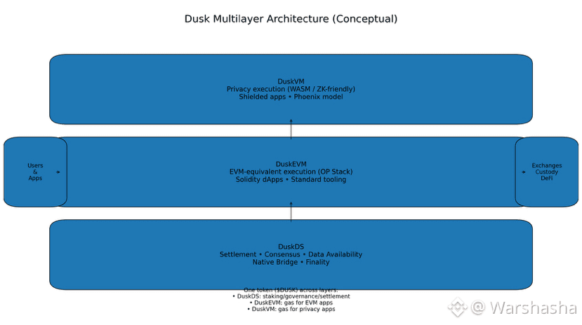 This structure is basically @Dusk saying: “We’ll keep settlement and regulatory guarantees strong at the base, and let execution environments specialize above it.”