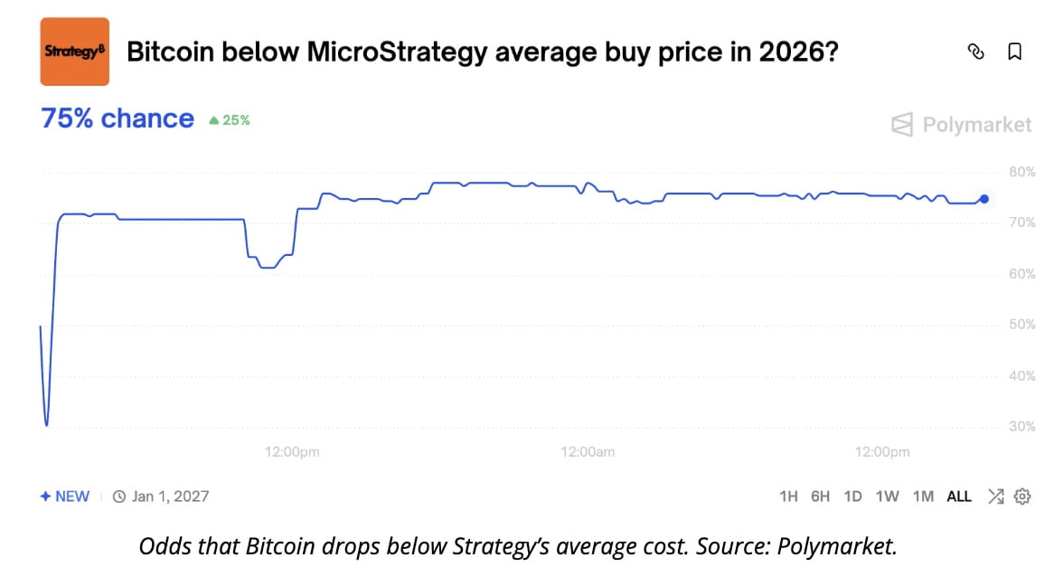 Các thị trường dự đoán đặt 75% khả năng rằng Bitcoin sẽ giao dịch dưới mức này vào một thời điểm nào đó trong năm 2026. Trên giấy tờ, điều đó nghe có vẻ đáng sợ. Trong thực tế, các nhà giao dịch đang tạo ra sự phân biệt rõ ràng giữa hành động giá và niềm tin của các tổ chức.