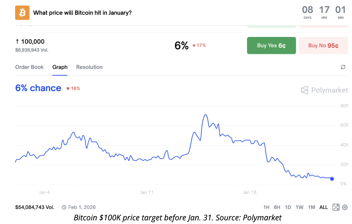 Trên Polymarket, các nhà giao dịch gán khoảng 6% khả năng rằng Bitcoin vượt qua $100K trước cuối tháng Giêng. Ở Kalshi, con số cũng không tốt hơn nhiều, dao động quanh 7%.