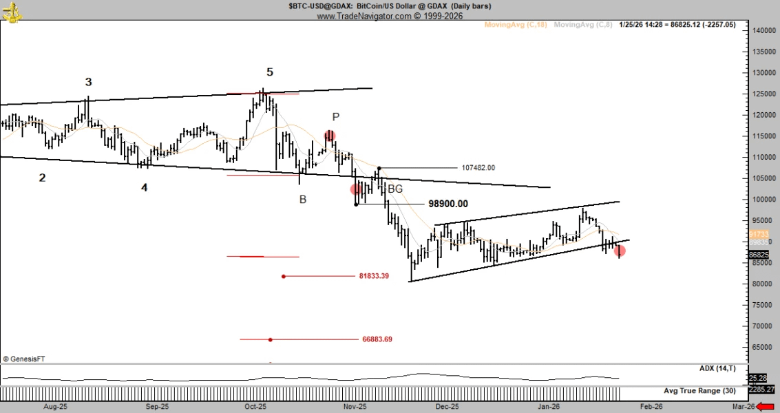 Nhà giao dịch kỳ cựu Peter Brandt đã chỉ ra tín hiệu kỹ thuật giảm giá trùng hợp với xu hướng giảm chung. Theo ông, bitcoin đã phá vỡ kênh giảm giá trên biểu đồ hàng ngày, phá vỡ ranh giới của kênh tăng giá được hình thành từ cuối tháng 12 năm 2025.