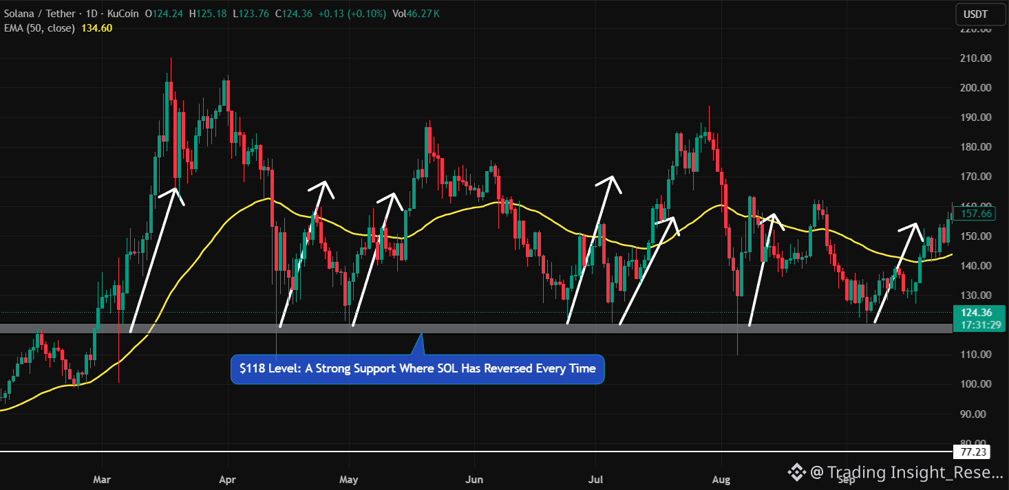 SOL đang bảo vệ vùng hỗ trợ $118. Kể từ tháng 4/2024, mức này đã được kiểm định hơn 10 lần, và lần nào cũng kích hoạt một đợt đảo chiều mạnh mẽ.