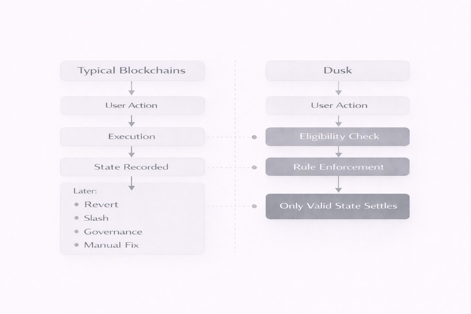 Dusk có một lập trường khác biệt rõ ràng. Nó coi các hành động không hợp lệ là những thứ nên chết trước khi chúng chạm vào sổ cái.