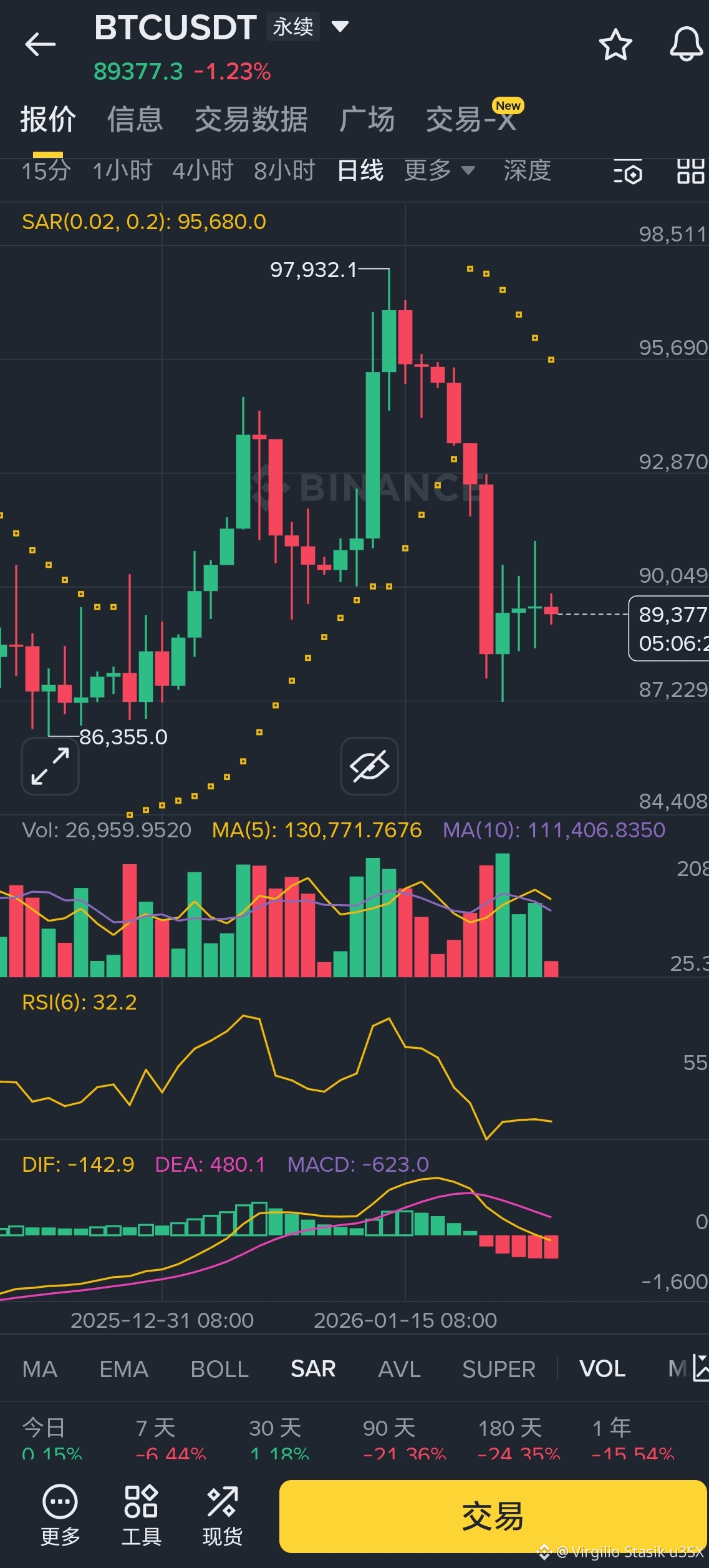 时下价格89,377 USDT(下跌1.23%),日K线处于明显回调通道中:价格走势:从2025年12月底高点(约97k-98k)快速回落,近期在89k-90k区间震荡下行,形成下降通道。最低触及86,355(图中标注),当前接近89k支撑。