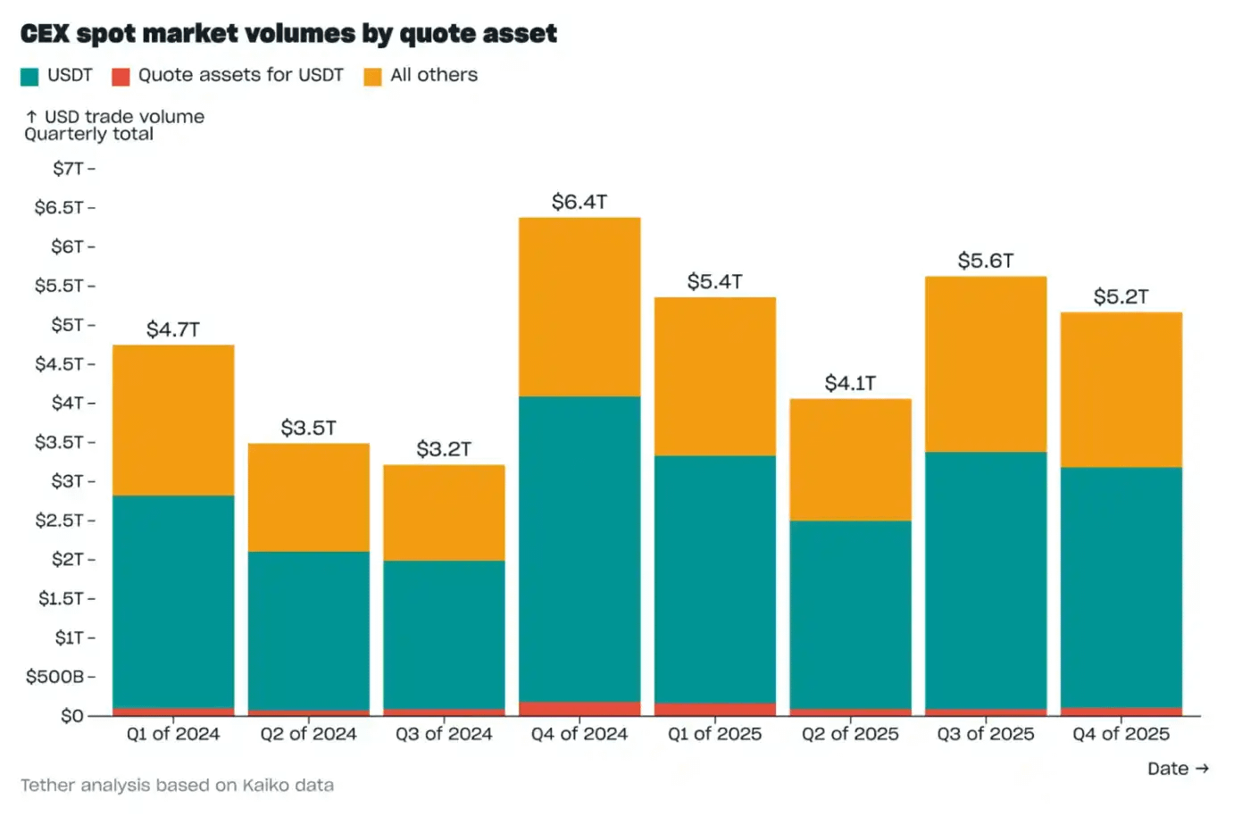 Trong quý IV năm 2025, khối lượng giao dịch giao ngay USDT trên các sàn giao dịch tập trung đạt 3,2 nghìn tỷ USD, trong đó 96,5% khối lượng giao dịch sử dụng USDT làm tài sản được định giá và phần còn lại sử dụng các tài sản khác thay thế cho USDT.