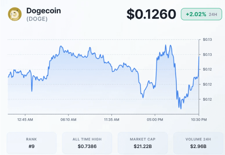 狗狗幣目前交易價格爲 0.1260 美元,過去 24 小時內上漲了 2.02%。交易量增長了 23.04%,達到 13 億美元,表明儘管價格下跌,市場興趣依然濃厚。